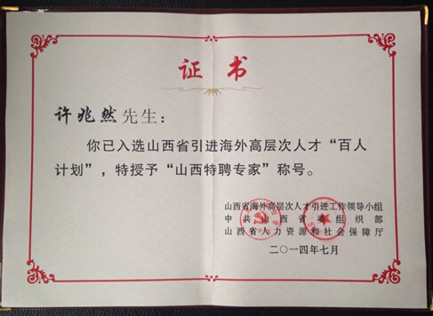 許兆然博士榮獲山西第七批“百人計(jì)劃”特聘專家稱號(hào)
