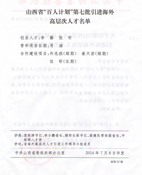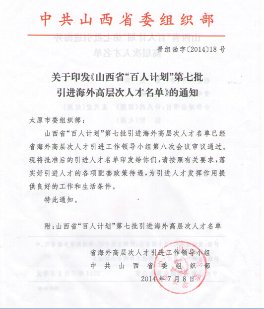 近日,山西省太原市委組織部公布了山西省“百人計(jì)劃”第七批引進(jìn)海外高層次人才名單,許兆然博士名列其中,是山西今年入選“百人計(jì)劃”的5位專家之一。